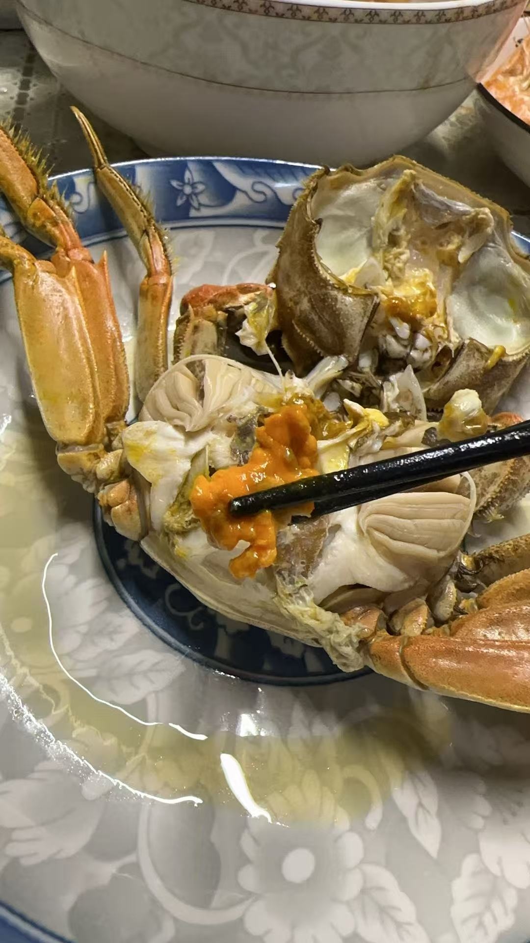 今天吃了几个,五两一个母的,很有肉,黄很多,一箱十个,我一个人可以吃三个