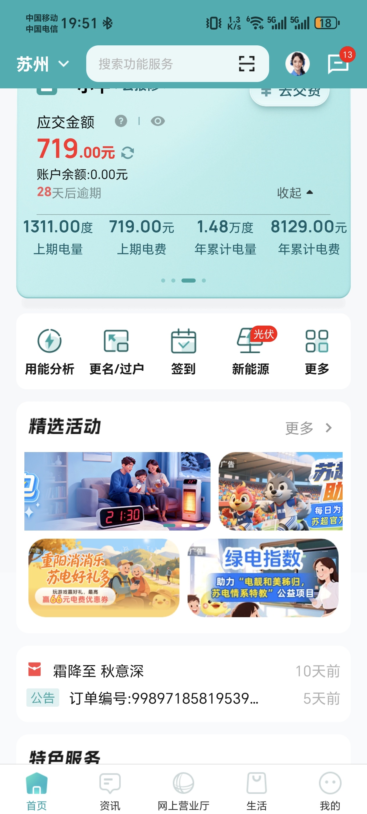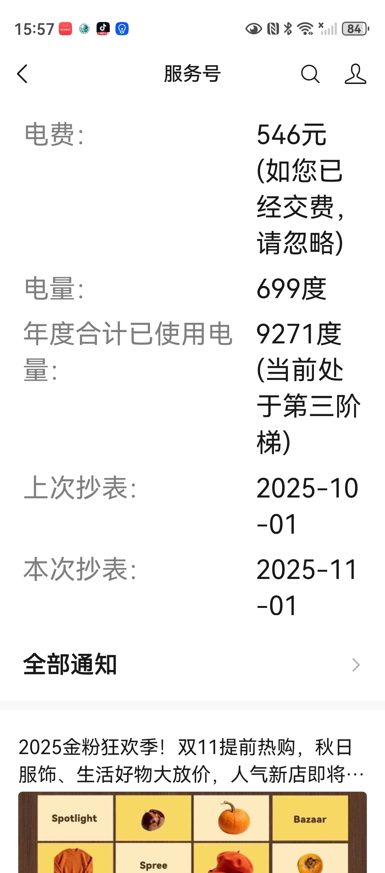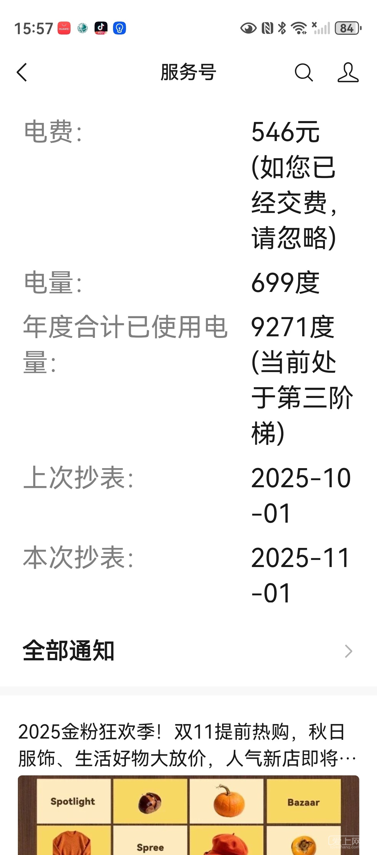 截至10月底,我家电量1822度。