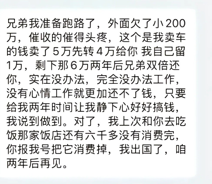 干什么生意二年后翻倍还,已经失败过一次了,还在幻想一夜暴富,如果只说二年后还你,我还觉得靠谱点,虽然说跑路之前至少还想着还了点钱,比大部分要起飞的人好,但看上去还是没接受教训,成功概率应该不高。