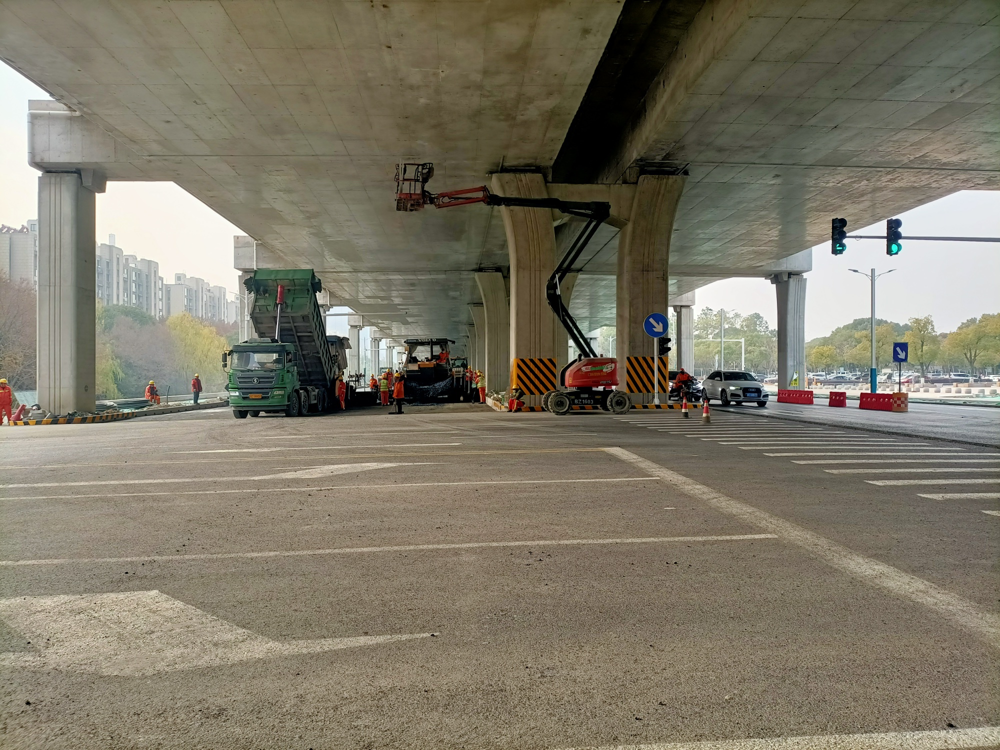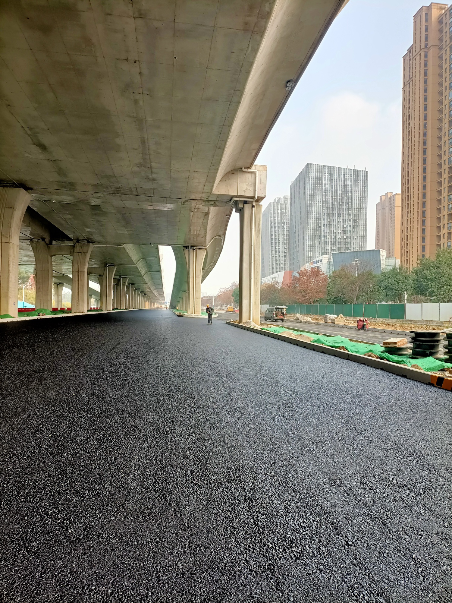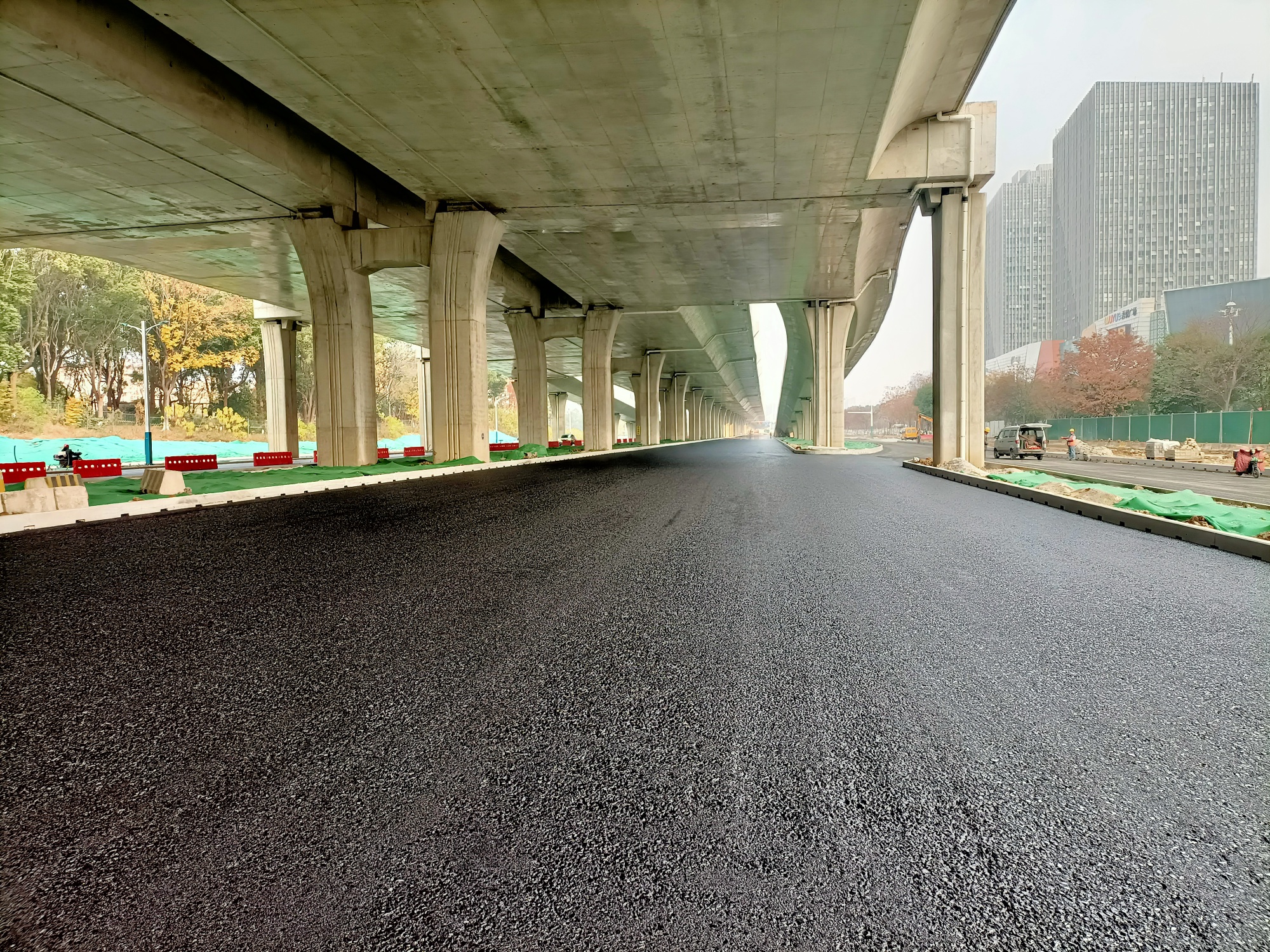 南半幅开始铺摊沥青基础层了