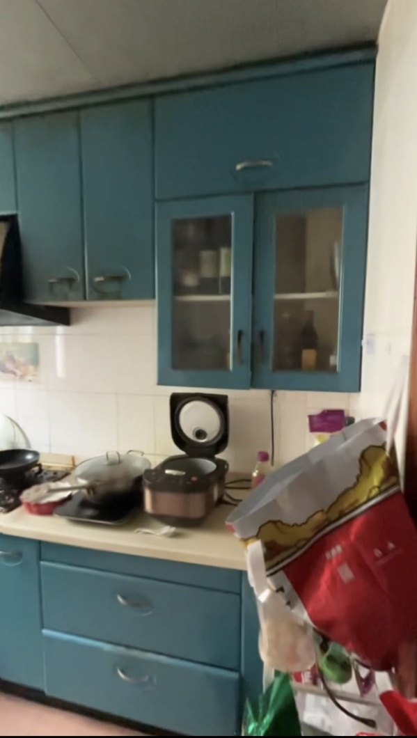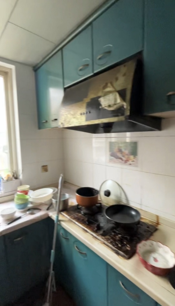 改造前:原始厨房以蓝绿色橱柜为主,布局紧凑,台面物品较多,整体略显拥挤。