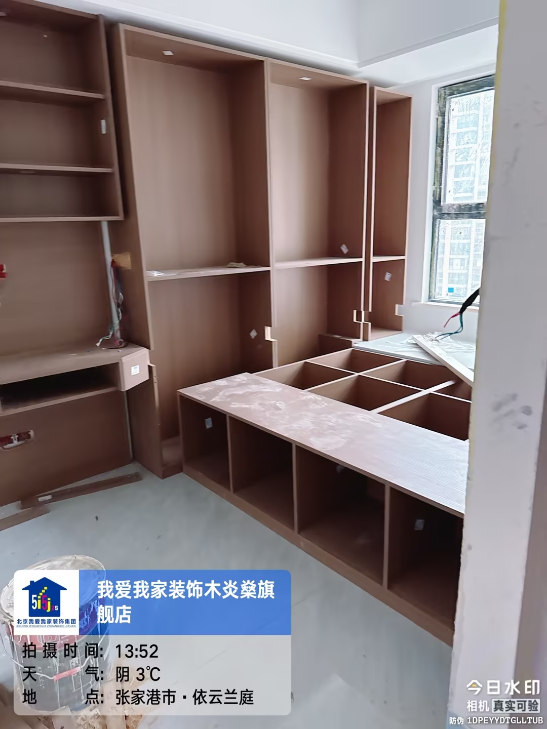 在依云兰庭的工地,客餐厅的柜体框架已经初见雏形。深木色的板材和错落的格柜结构,既保证了收纳功能,也为空间预留了层次感。