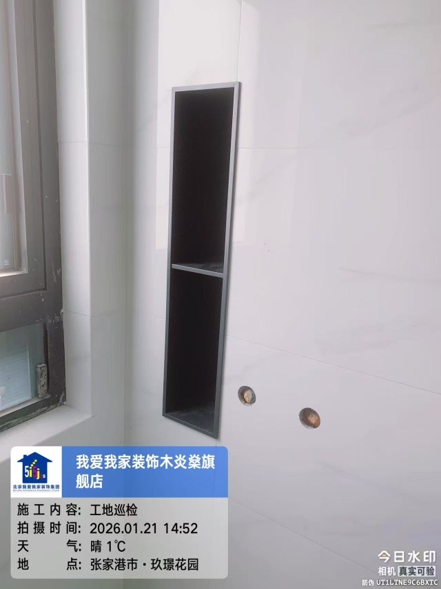 卫生间的壁龛已经嵌入墙体,黑色金属边框和白色瓷砖形成了简约的视觉对比。我们现场确认了壁龛的承重性和防水处理,避免后期使用出现隐患。