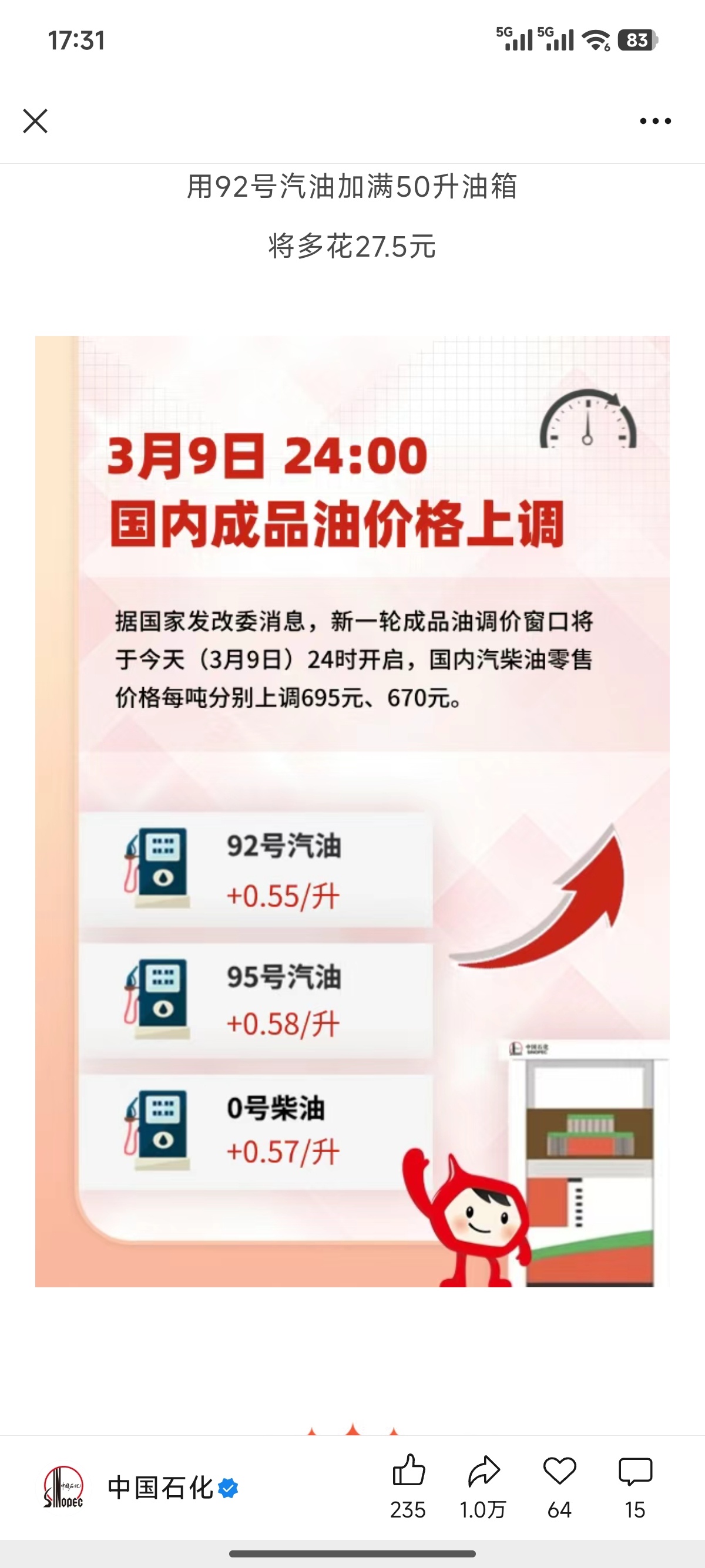 小意思,2022年6月17日加过9.38元/L(92#)