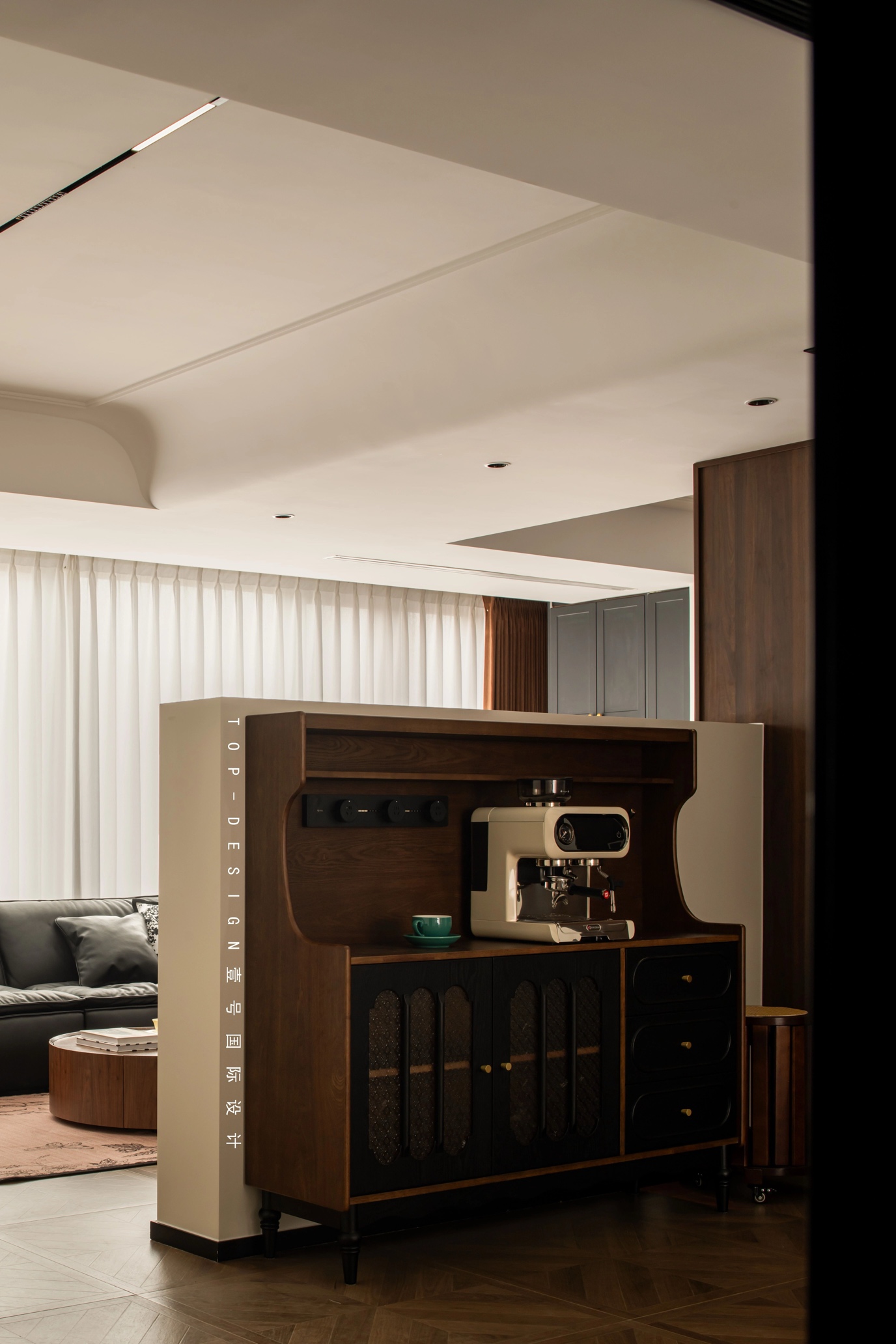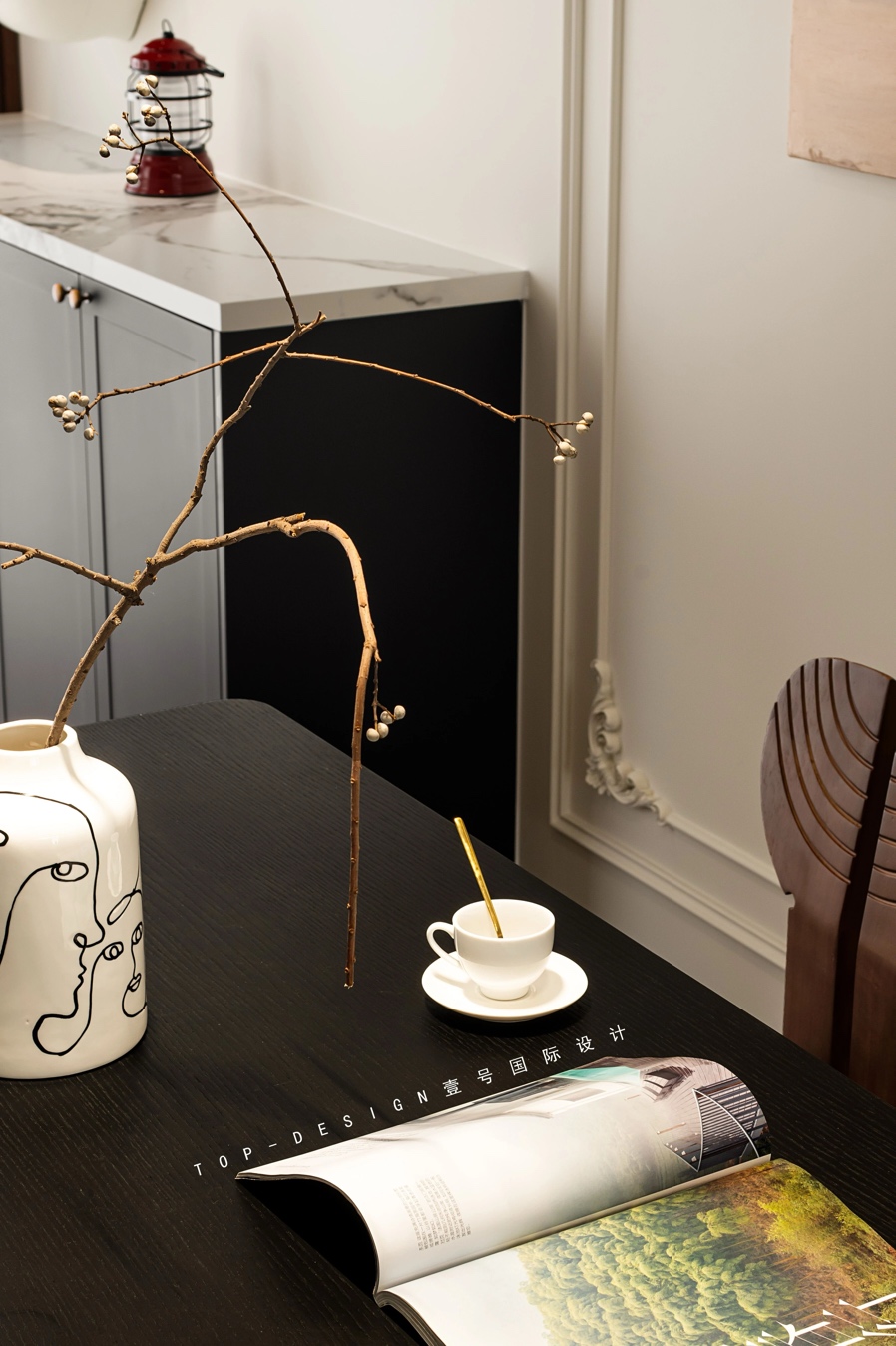 黑色的柜门边框搭配着带有古朴的网格纹理的玻璃,增添了几分神秘与典雅。斗柜上方的台面,咖啡机与墨绿咖啡杯的组合,为生活增添一份惬意与仪式感。
