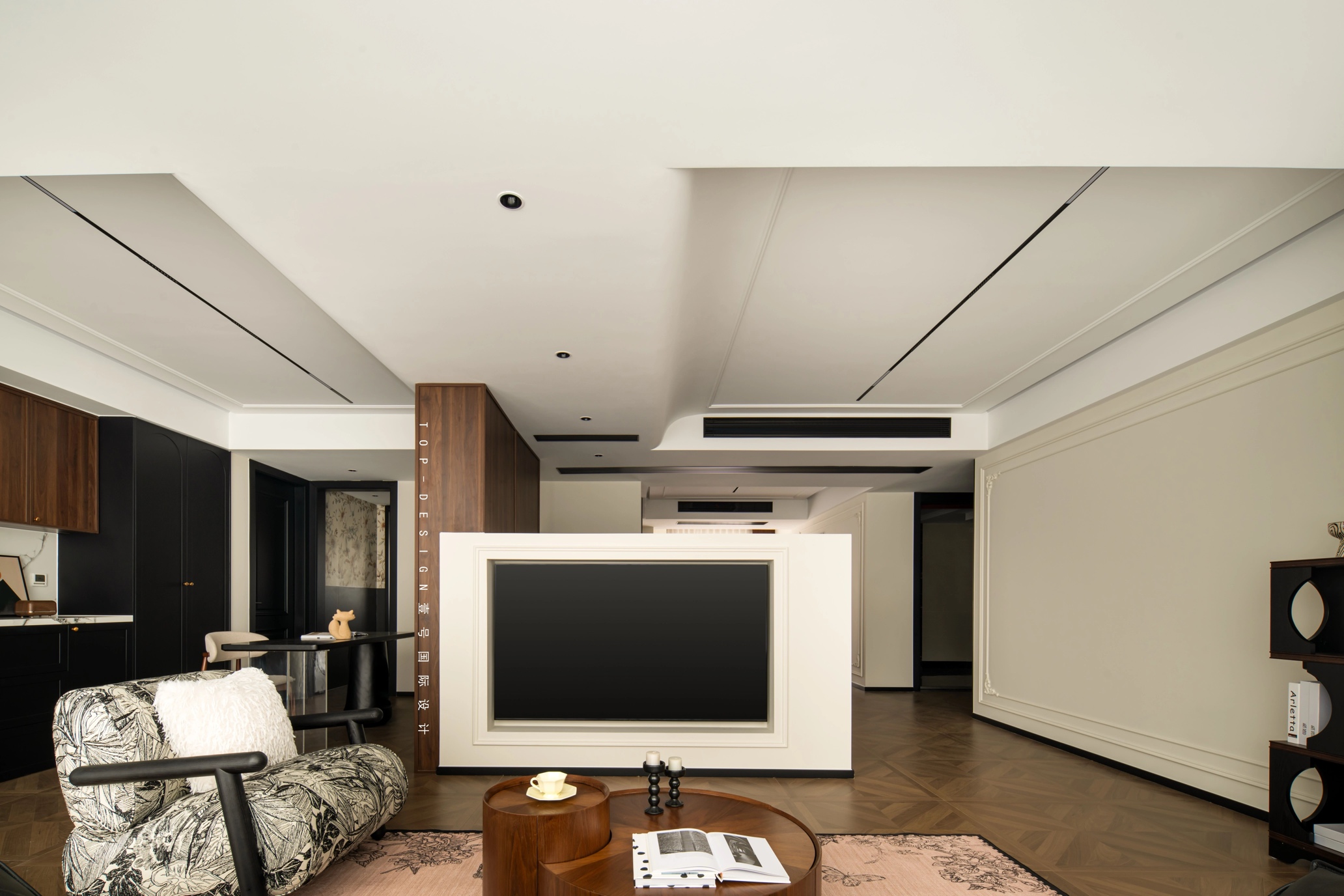 半墙电视背景宛如灵动的画框,将黑色的电视屏幕巧妙嵌入,白色的墙体与周边的深木色形成鲜明对比,既有现代的简约利落,又蕴含着中古的含蓄雅致,成为客厅的视觉焦点之一。