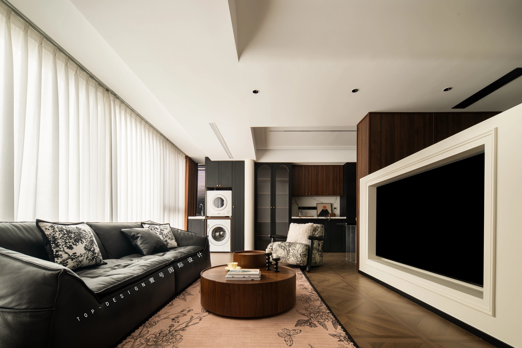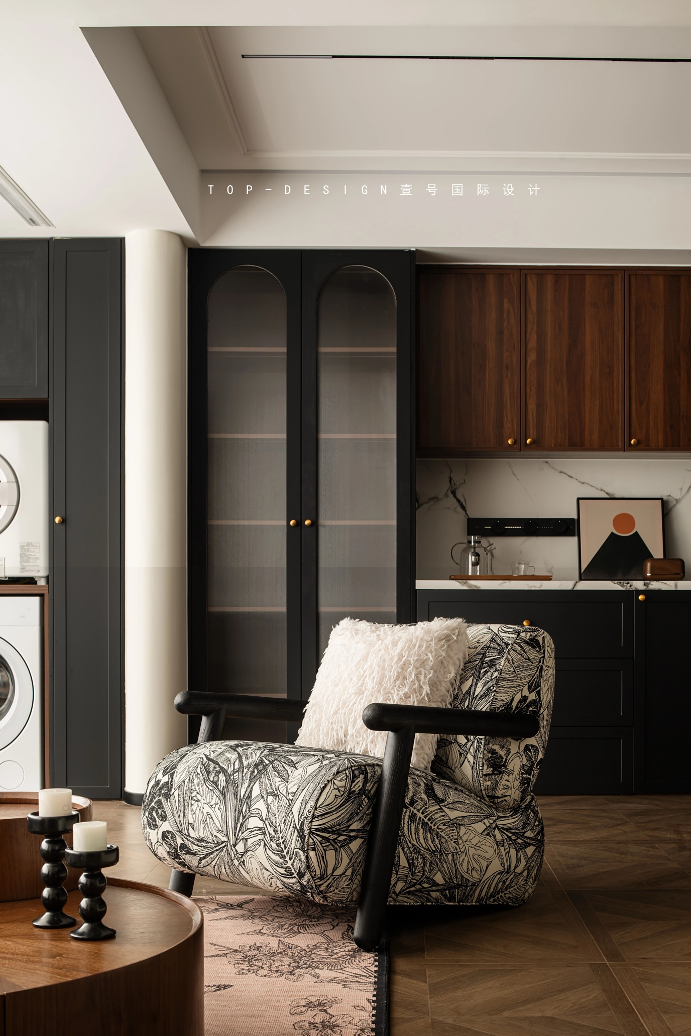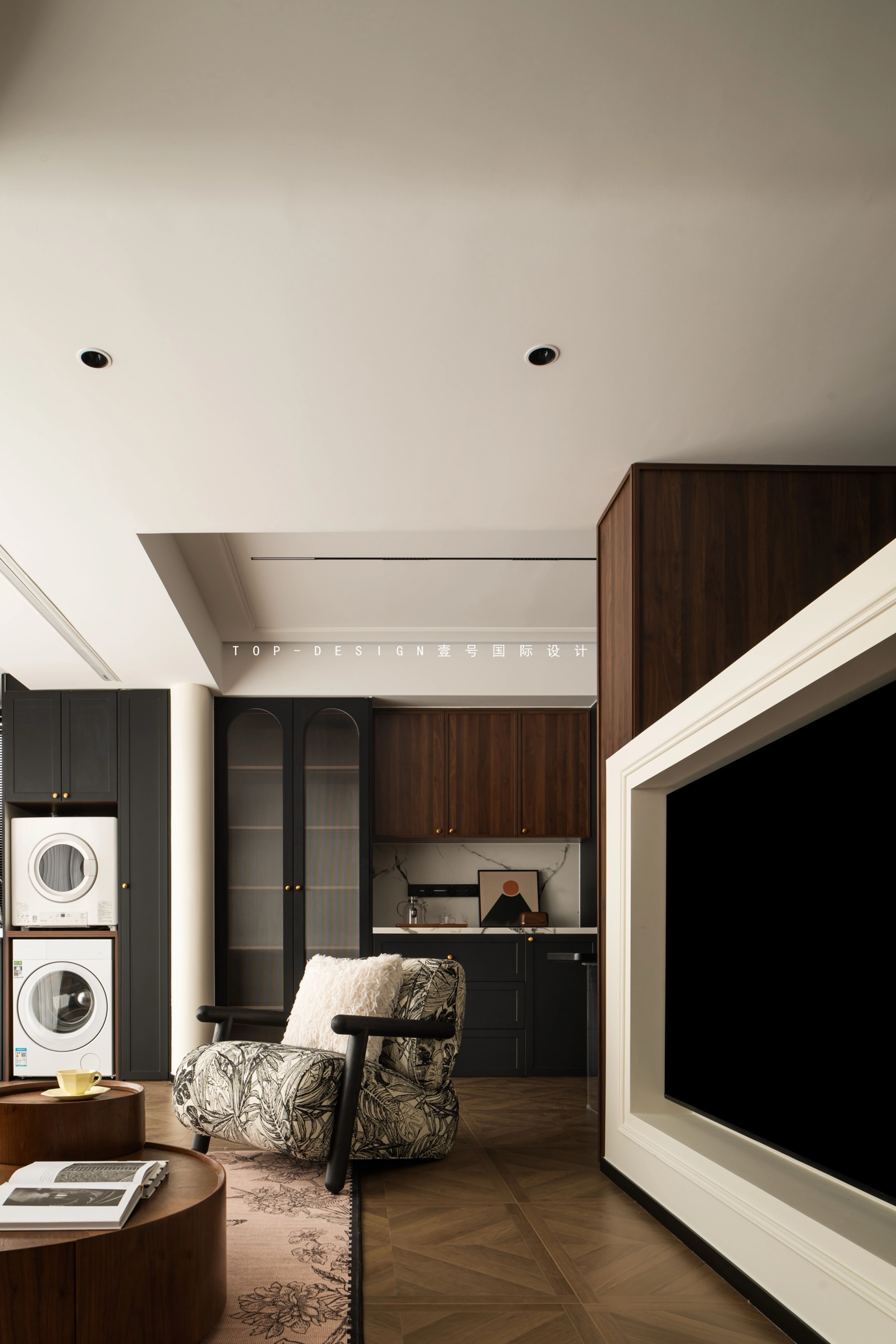 最有趣的是,客厅的一角还巧妙地藏着一个洗衣区。洗烘组合嵌入黑色储物柜,既实用又美观,仿佛是在告诉人们,生活虽然琐碎,但也可以充满格调与趣味。