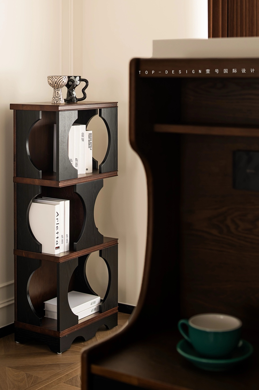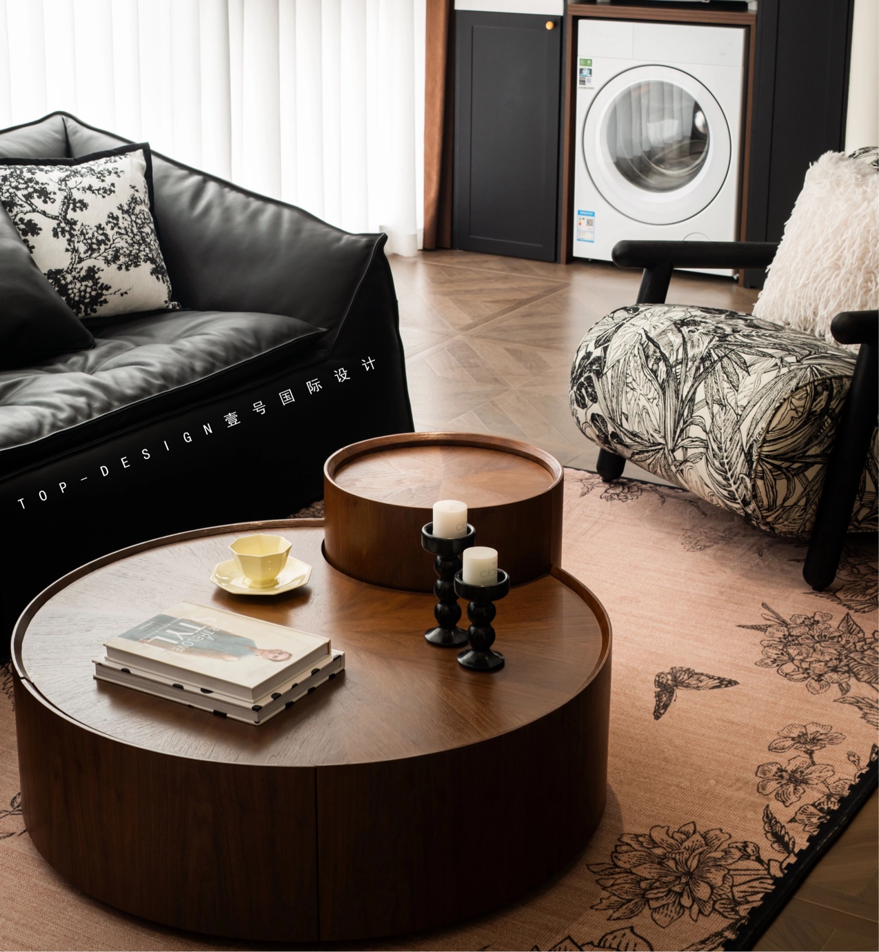 圆形木质茶几上,几本书籍随意地摆放着,一旁的咖啡杯与黑色烛台组合,更是为这个空间增添了几分生活气息与艺术感。