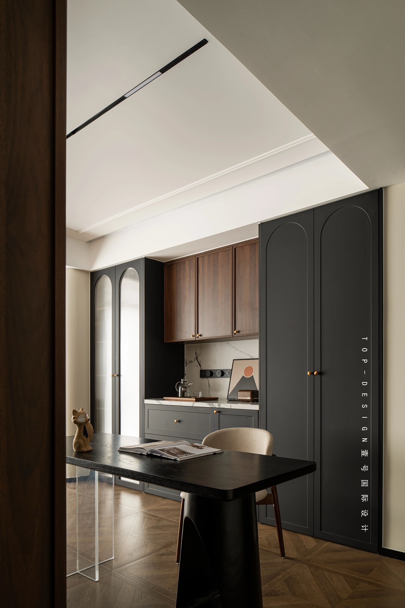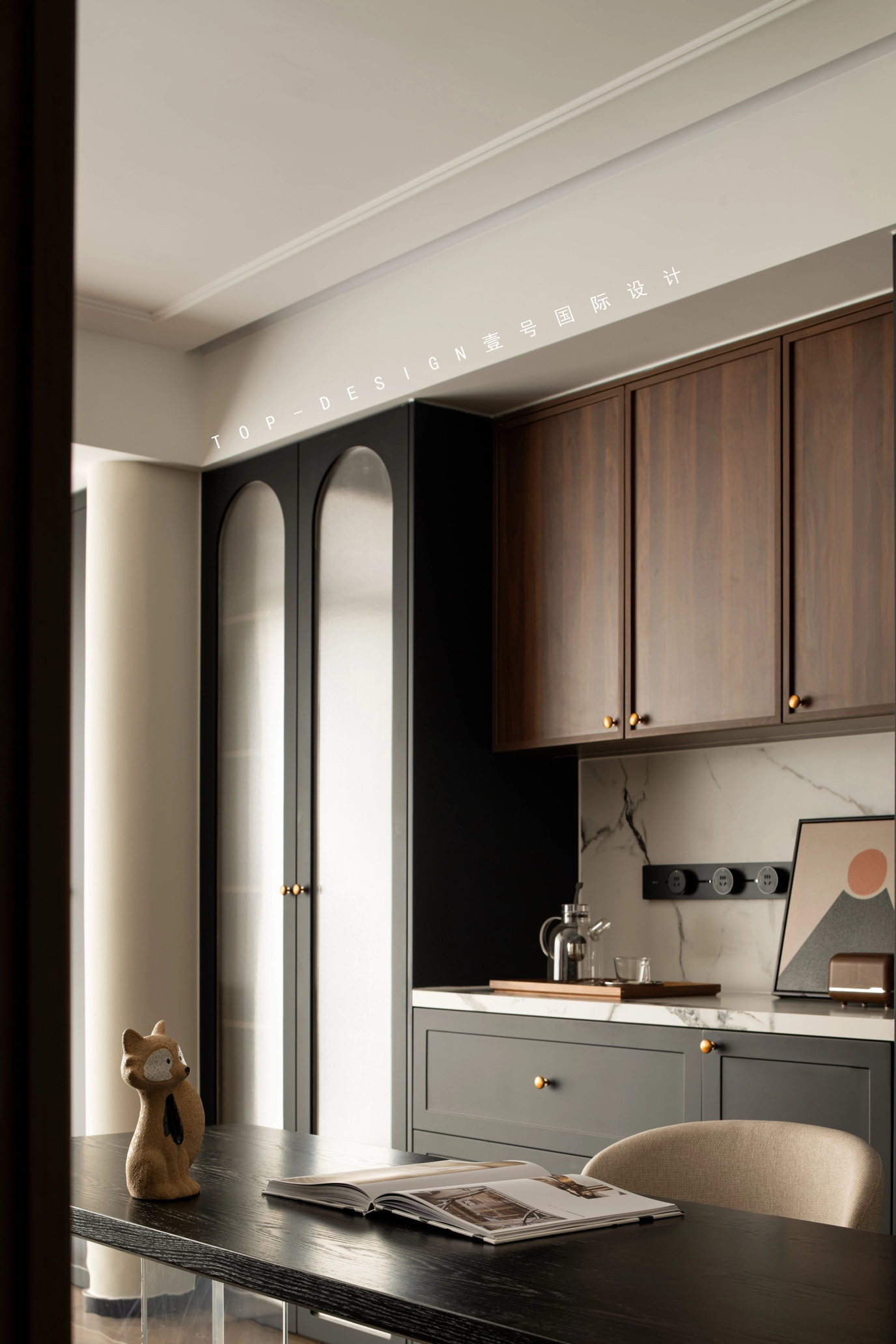 书桌后方,是一组精心设计的柜体组合。木色的吊柜与黑色的边柜相得益彰,大理石的台面则为空间注入了自然的元素与高级的质感。