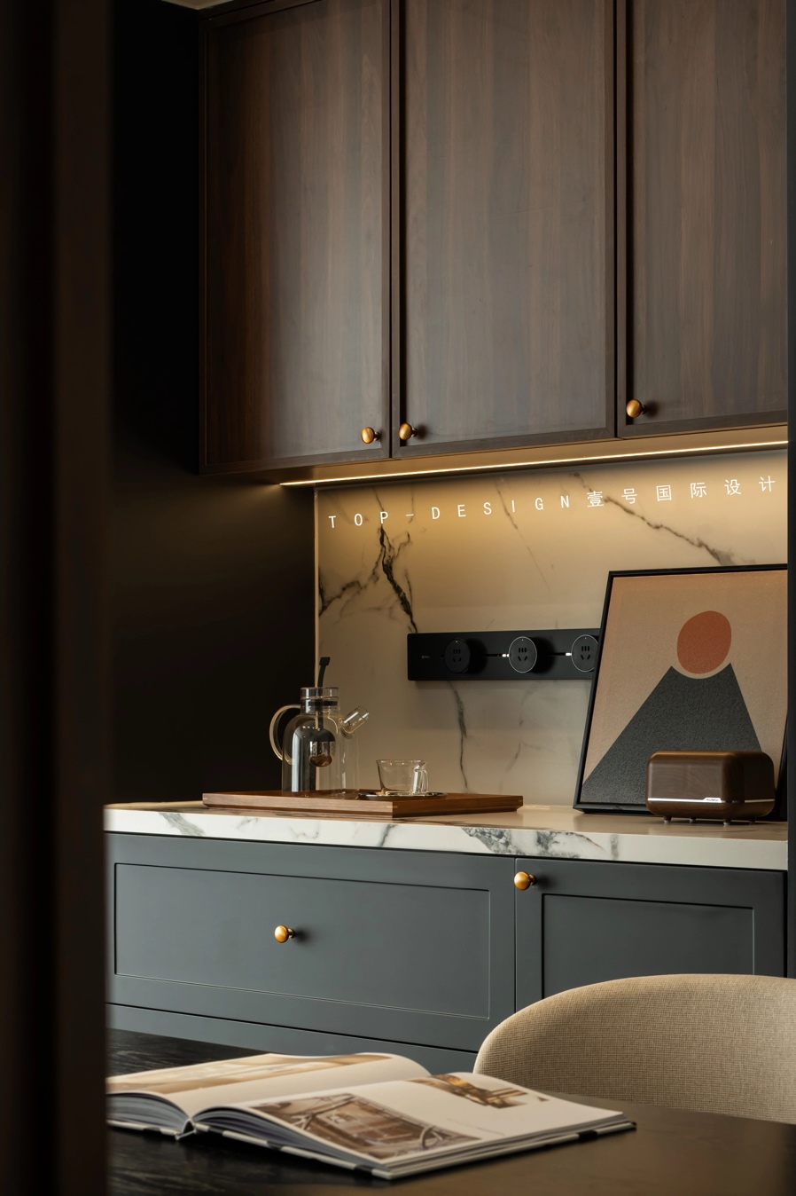 台面上,茶具组合与装饰画错落有致地摆放,既满足了日常的使用需求,又成为了一道别致的风景线。吊柜下方的轨道插设计,巧妙而实用。