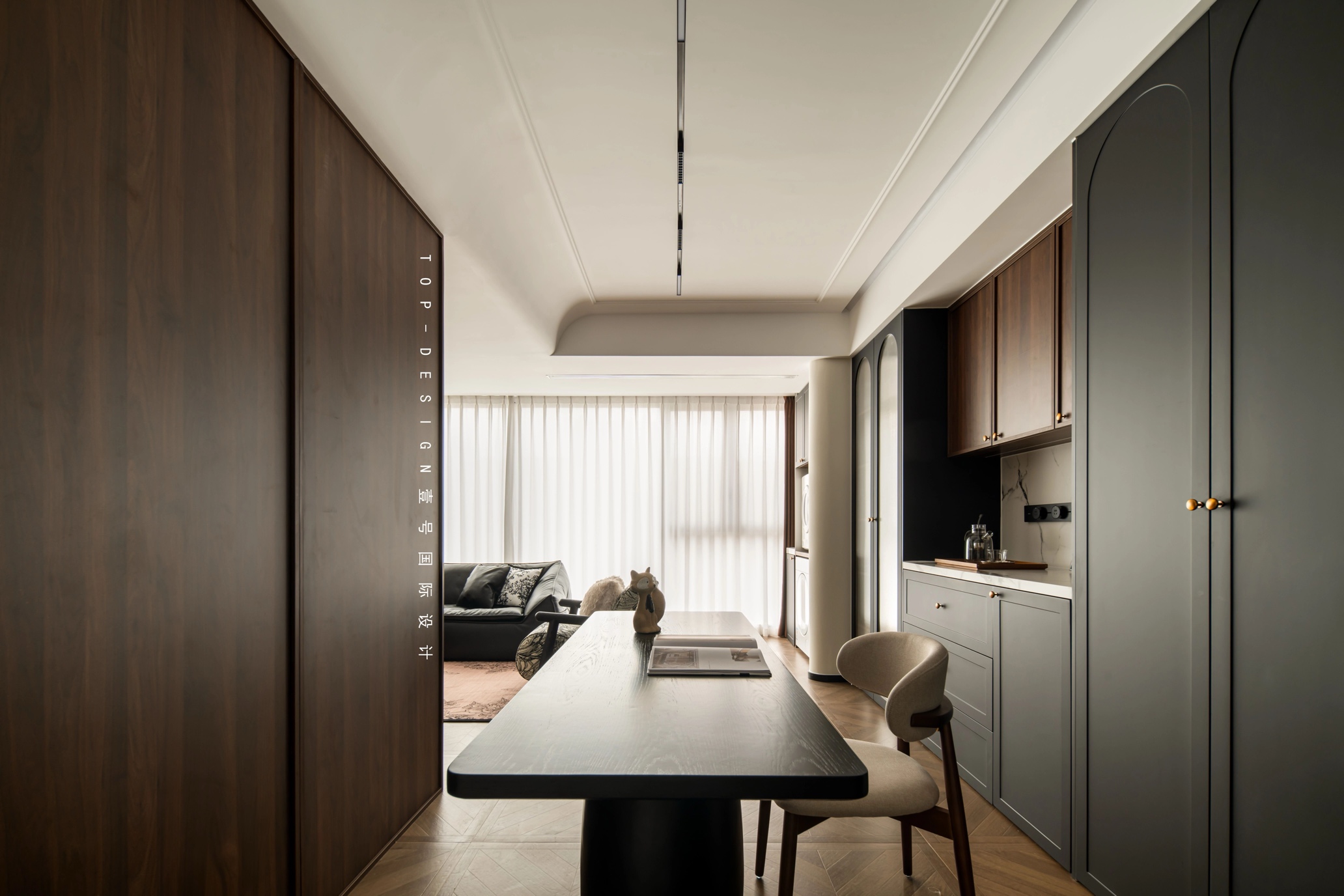 书房与客厅之间,没有明显的隔断,却通过空间的巧妙布局和色彩的微妙过渡,形成了既独立又相连的微妙关系,让整个家居环境在通透中又不失私密与宁静。
