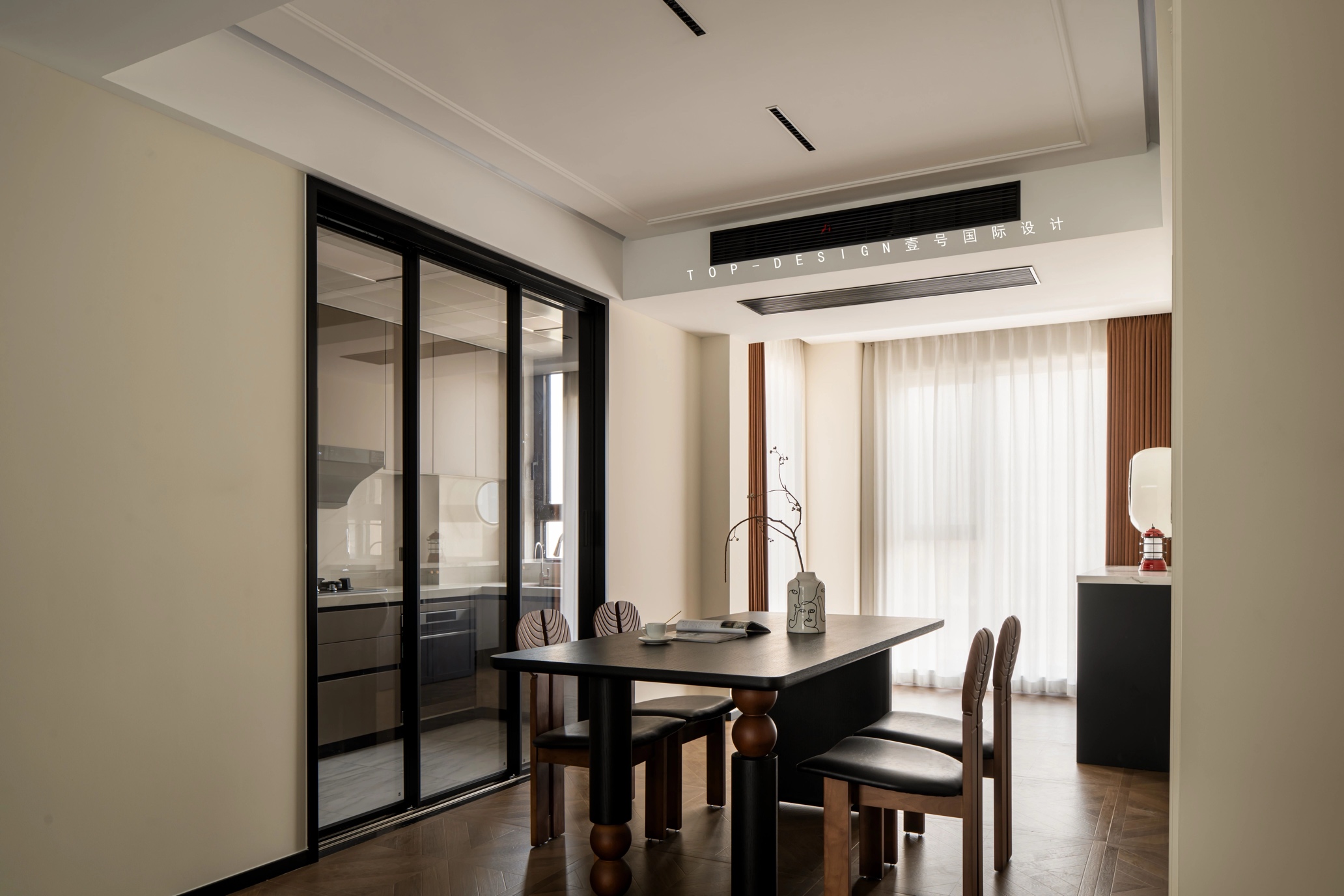 餐厅里,沉稳的深色餐桌配着木质餐椅,尽显中古风情。一扇黑色边框的玻璃推拉门巧妙地将餐厅与厨房分隔开来。
