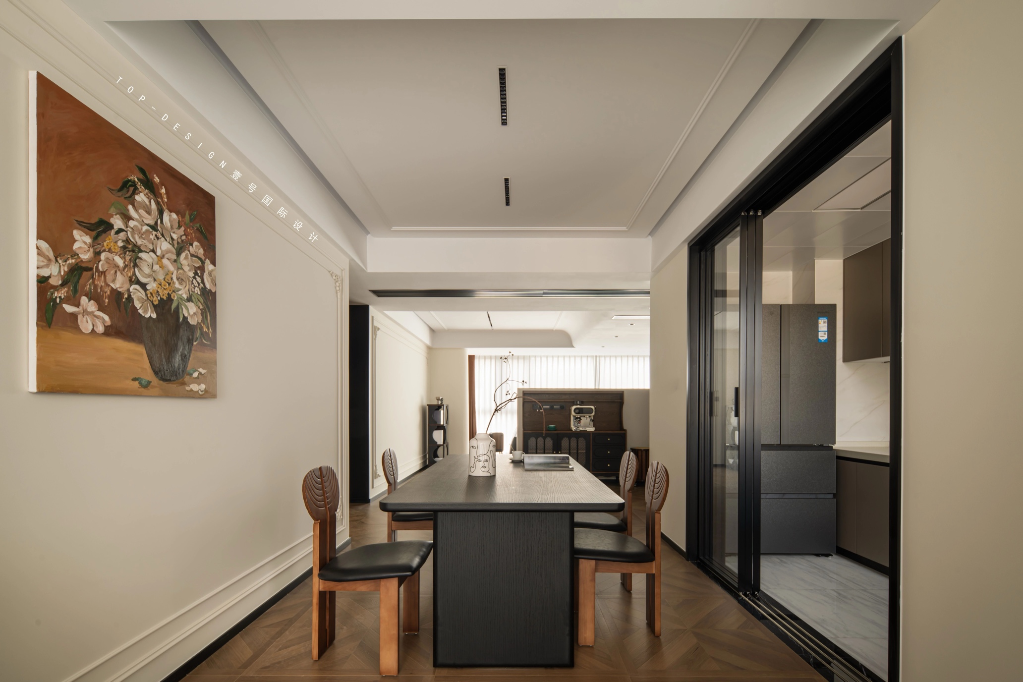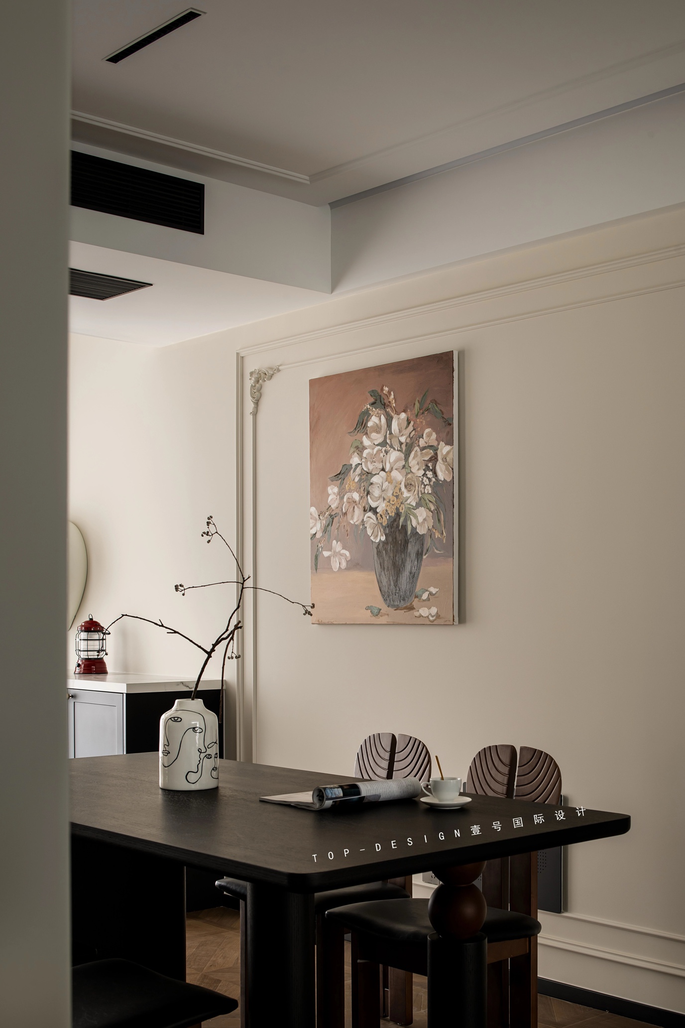 餐厅的左侧墙壁上,一幅大型的花卉油画成为了视觉焦点。油画与周围简洁的白色墙面形成鲜明对比,更突显了其艺术魅力。