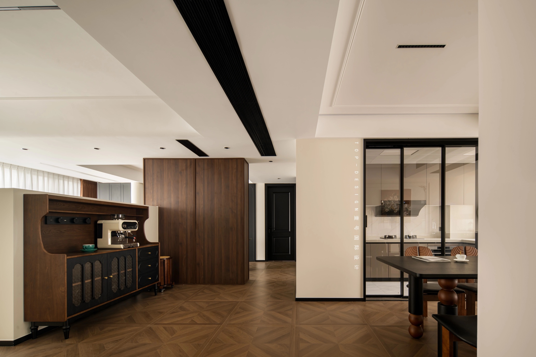 透过玻璃,隐约可见厨房内现代化的电器与整洁的台面,既保证了空间的通透感,又有效地阻挡了油烟的扩散。