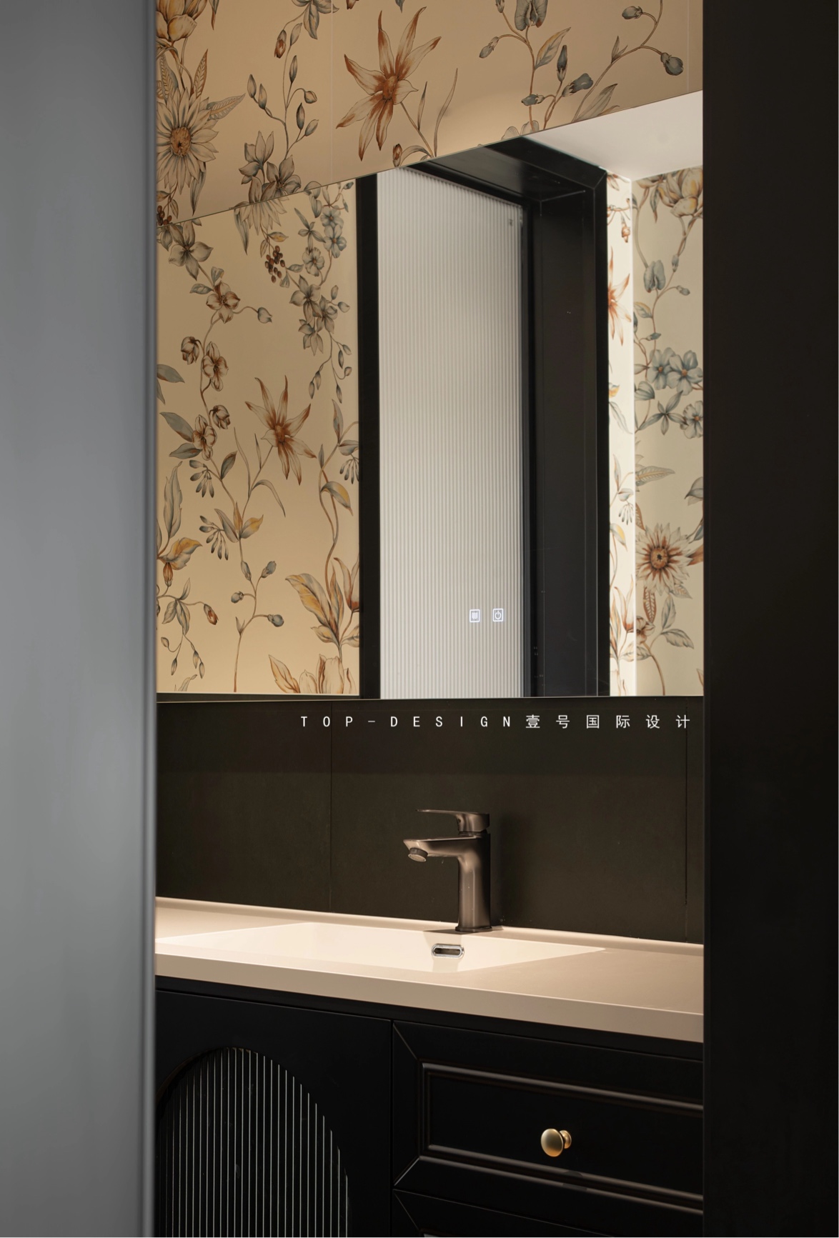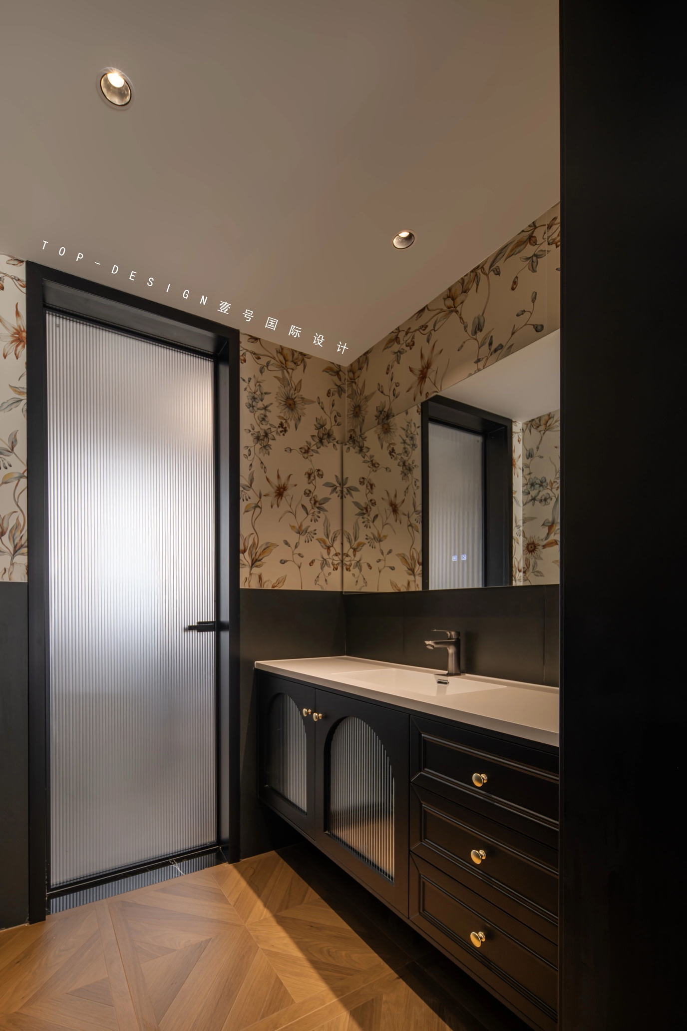 复古的花纹壁纸是干区空间的亮点,仿佛将人带回到了旧时光的繁华。黑色的柜体与金色的把手搭配,精致而典雅。