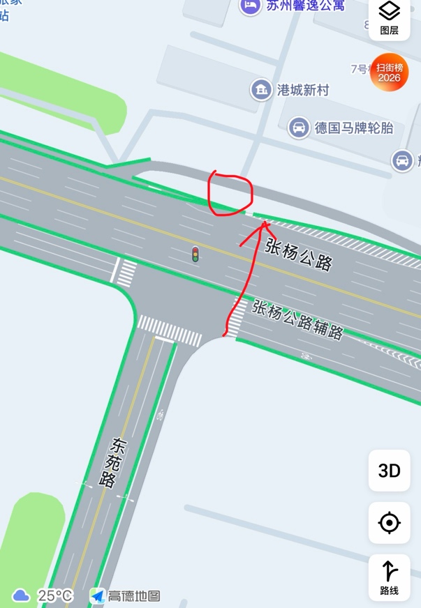 穿过张扬公路后,在那个路口处等,等那个小路口对向的灯变绿后再行驶,这个需要特别注意,因为现场的情况还挺复杂,车道很多,在高架下面,红绿灯也非常多,一不小心就看错了