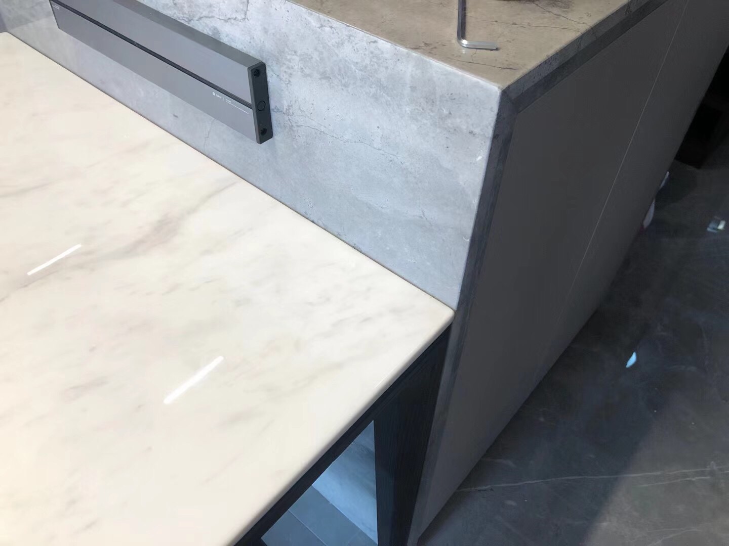 我老公说,这就是真正的“墙压地”!可见我家贴砖师傅手艺杠杠滴吧!~我偷偷量了一下砖,一毫不差,嘿嘿!懂行的人自然懂了!另外边角切下的小砖,一点也没有浪费,完美地被用上,贴在地柜下,足见贴砖师傅的用心和水准。贴完,我家的砖还多了好几片呢,已顺利退回,666~