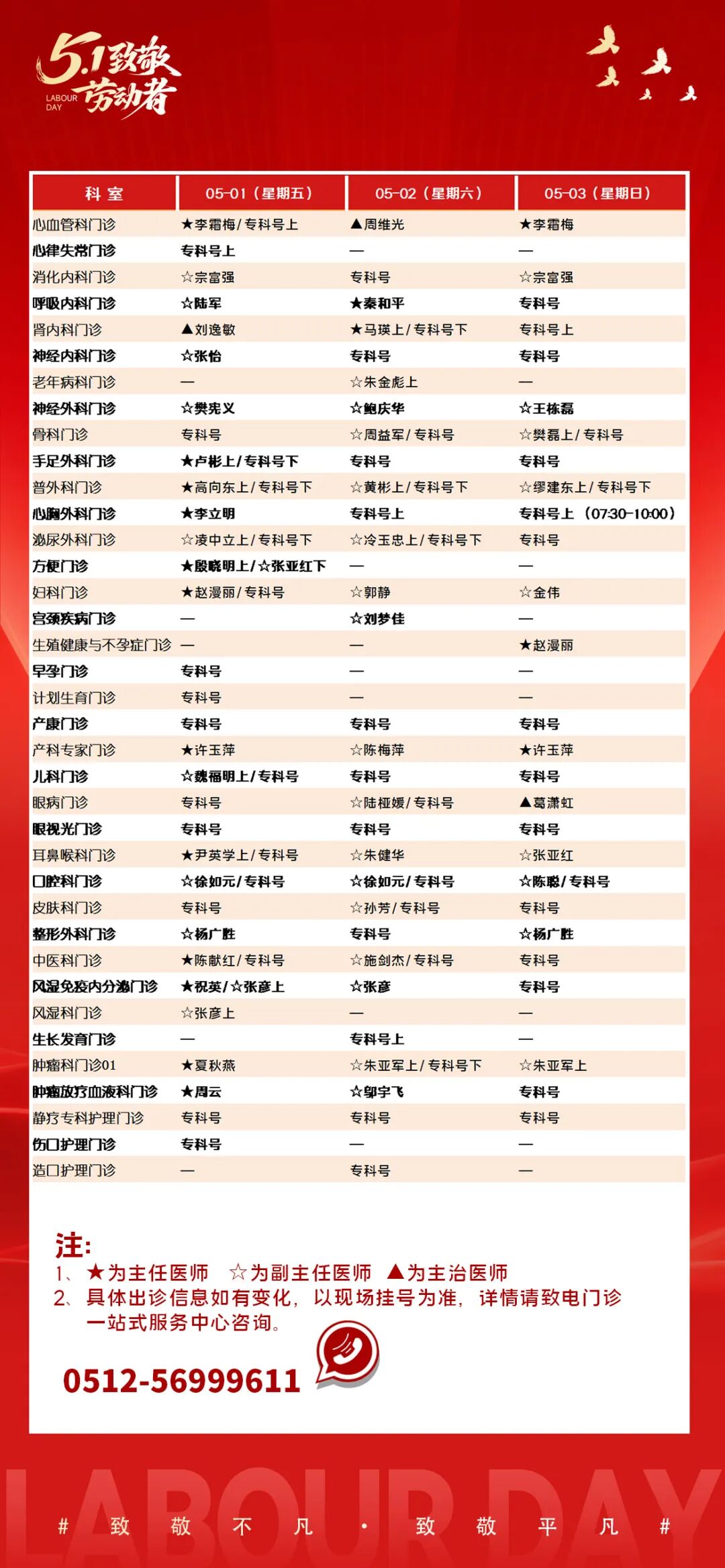 “五一”门诊排班表