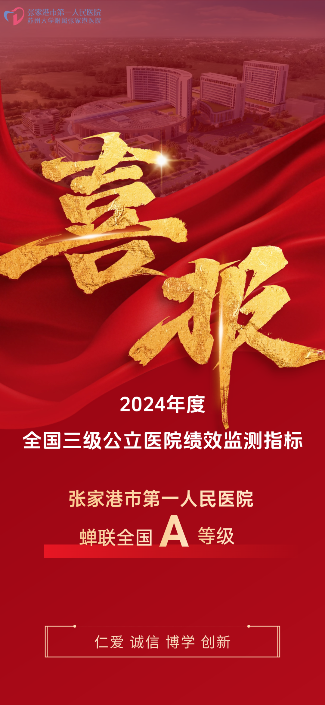 近日 ,国家卫生健康委公立医院绩效监测平台公布2024年度国家三级公立医院绩效监测结果,张家港市第一人民医院蝉联A等级。