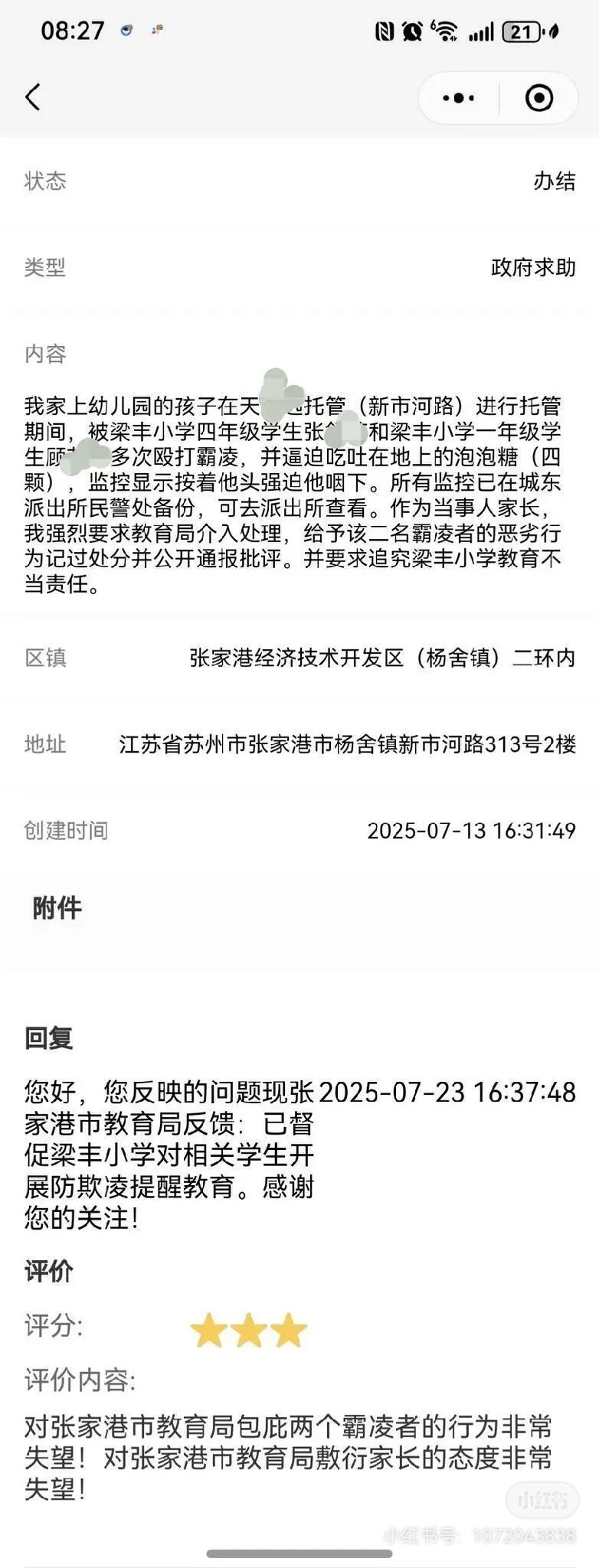 发出来就是让大家避雷新市河路的天X远托管。和梁丰小学的这两个小初生。希望她俩的同班同学能看到,知道她们是什么样的人,远离她们,避免被霸凌。