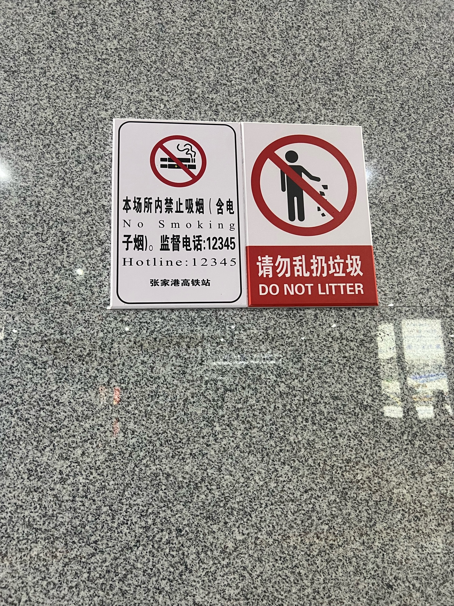 高铁站禁烟标识下面有垃圾桶上烟灰缸