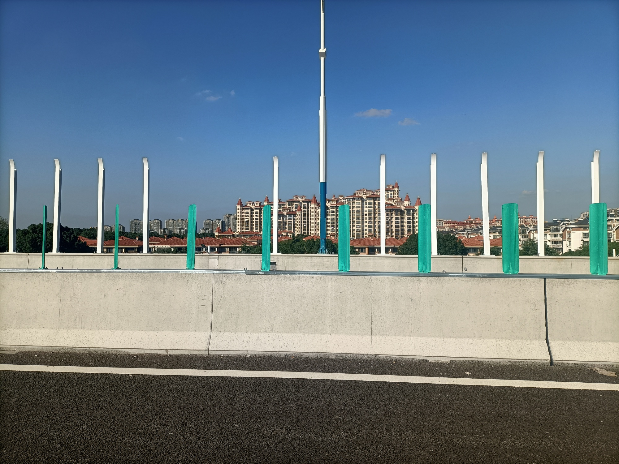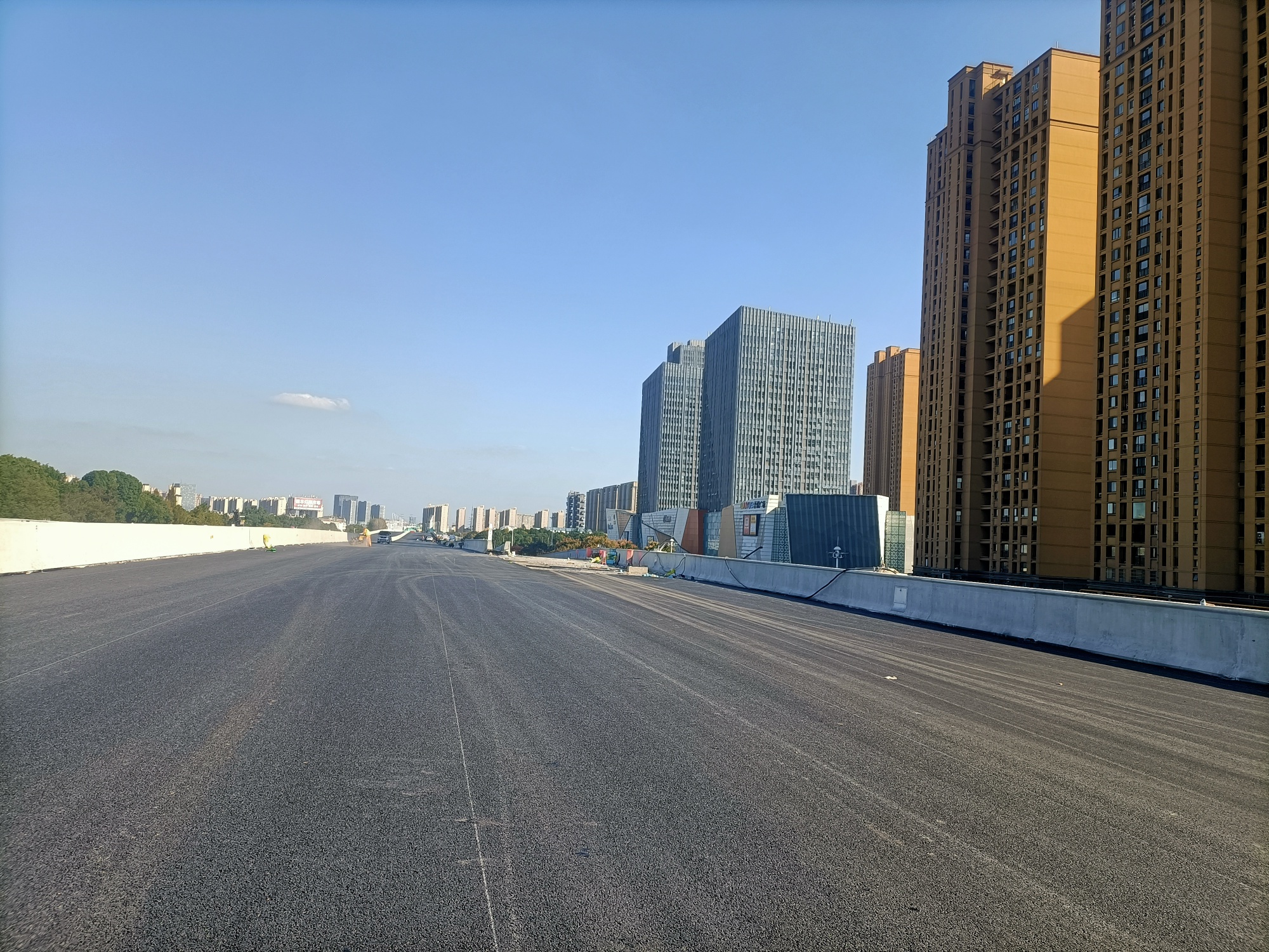 金港大道至长安南路段高架道路沥青路面(除上下匝道)已铺摊完工,在做伸缩缝,安装降噪屏,划线等,地面道路北面部分在浇沥青基础,