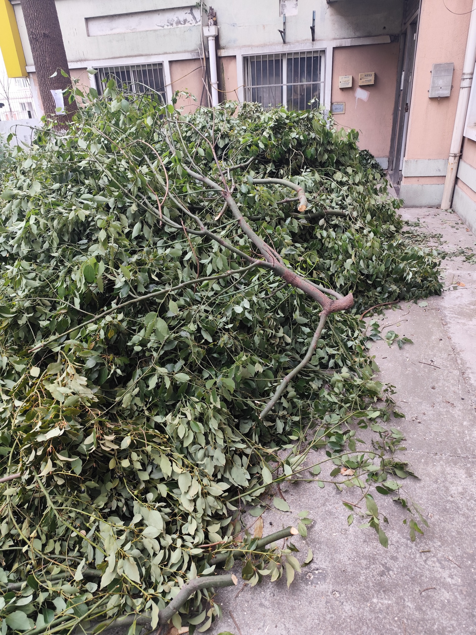 最近花园浜在开展修剪树枝还居民阳光活动 这活动很好 点赞 但是修好的树枝就这么堆着 己经好几天了 没人管 单元门都快进不去了