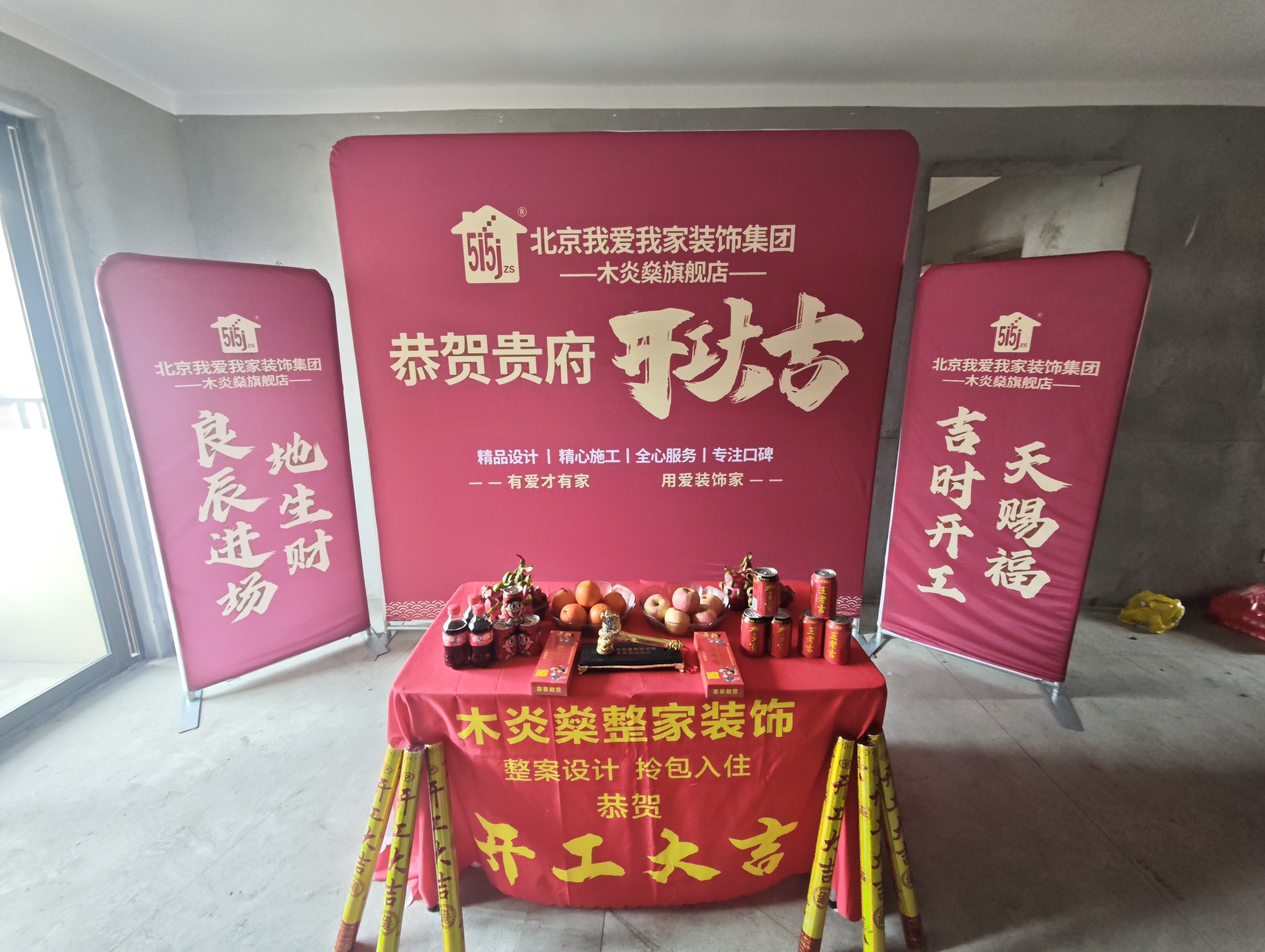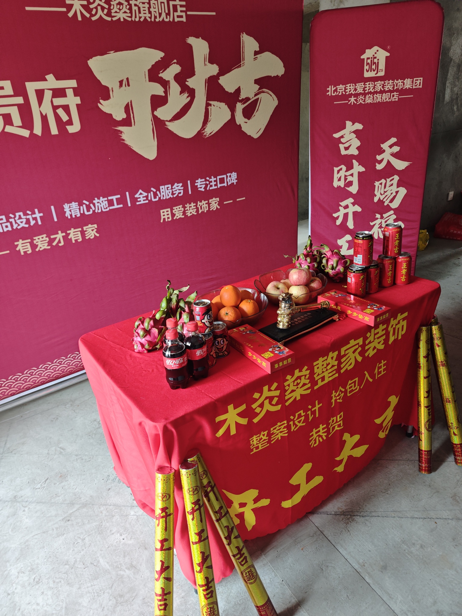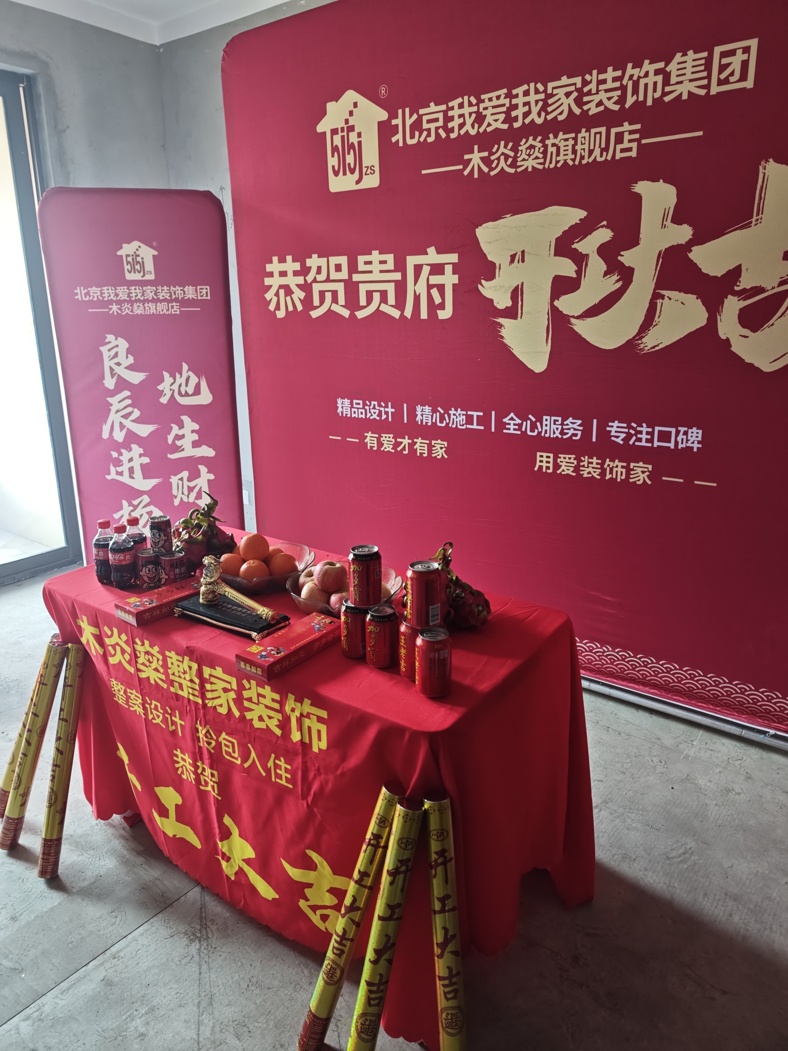 设计师与施工团队在现场再次核对细节,确保每一处布局都精准落地;桌上的水果、旺仔与香烟,是我们对业主新家红火兴旺的美好祝愿;地面摆好的红绸葫芦造型,更是藏着“福禄进门”的暖心寓意。