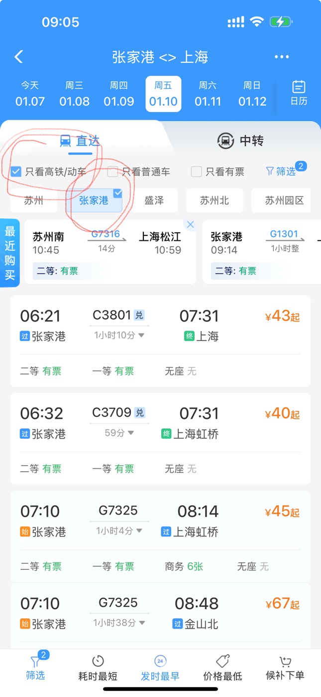 。。。只看高铁/动车选项下面一行 看到 苏州 张家港 苏州北 苏州新区等字了吗?点一下张家港,让它变成 ...