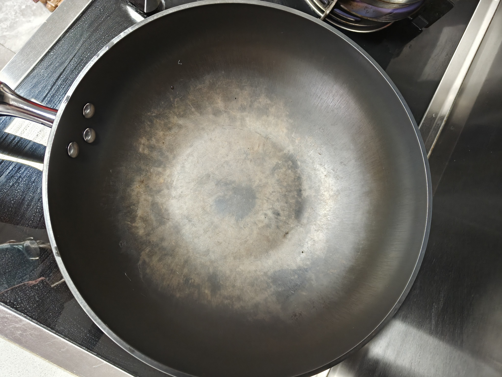 涂层锅才不会这样,你这估计是用来烧汤了,或者蔬菜炒多了,铁锅想要看上去油光水滑,那就要避免钢丝球,避免洗涤剂,平时用完烤干上油,多做重油的或者荤菜可以快速形成油膜,以后用起来不粘锅,且颜色好看,锅用成你这样那就再开一次锅,但你的炉火温度低,开不好的,即便全部烧蓝,只要你用法不对还会成这样