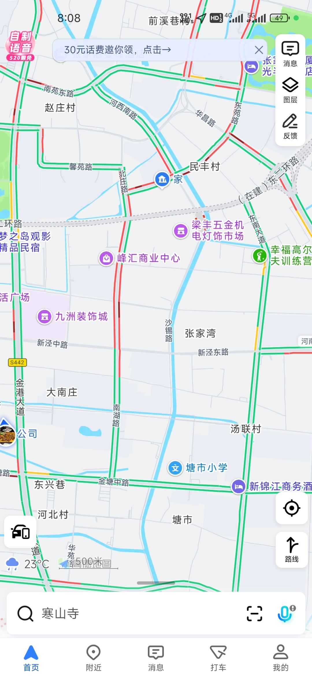 同样路程早高峰35分钟,下雨40分钟。晚上九点回家二十五分钟。